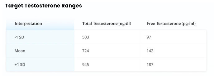 When most people talk about their testosterone levels, they are referring to total testosterone, which is the form most commonly tested. The range considered normal in most laboratories is 300 to 800 ng/dL, but this number does not indicate how much of that testosterone is free. At the same time, this bracket presents such a wide range that it isn’t always clinically meaningful beyond simply diagnosing hypogonadism and also doesn’t take symptoms into account. Rather, we suggest focusing on a target range which is within +/- 1 standard deviation (SD) of the mean.