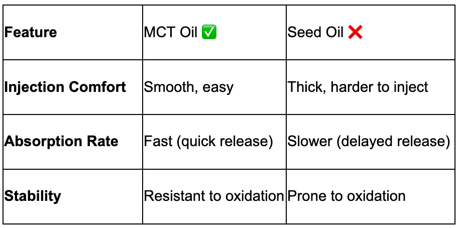 For optimal testosterone delivery and smoother injections, some choose MCT over seed oil.