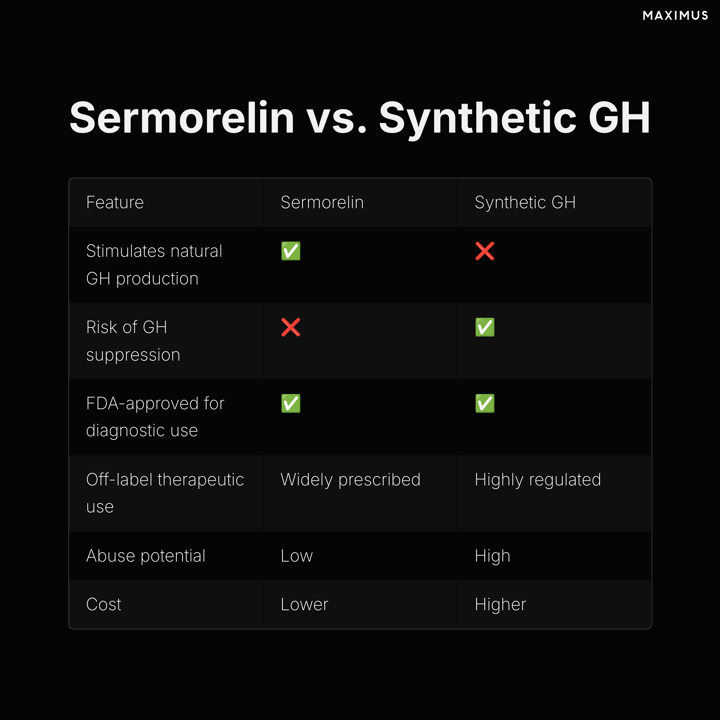 Sermorelin is FDA-approved for diagnostic use and commonly prescribed off-label for age-related hormone support. Because it works with your existing system, it allows for safer long-term use and easier clinical monitoring. Synthetic GH is also FDA-approved but has stricter indications, which makes off-label use significantly harder.